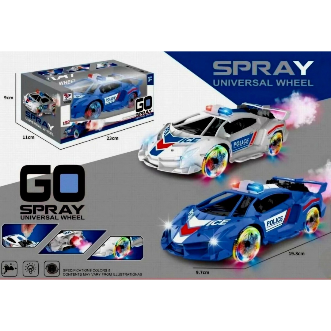 Ignite your child’s imagination with the GO SPRAY Universal Wheel Police Car, a thrilling toy built for endless action, sound, and light! This high-speed police supercar features 360° rotating wheels, dynamic LED lights, realistic siren sounds, and a unique mist-spraying effect that turns every play session into a captivating chase adventure.