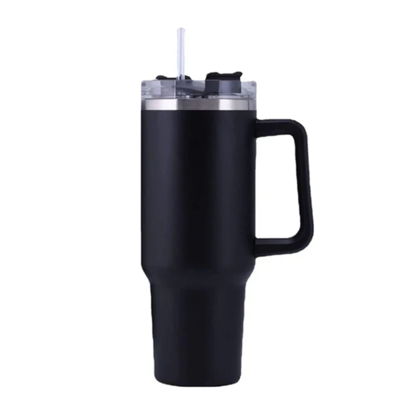 Crafted from high-quality food-grade stainless steel, the tumbler features a durable powder-coated finish for a stylish, non-slip grip that resists fading, peeling, and cracking. It comes equipped with a convenient handle and a leak-resistant straw lid, making sipping easy and mess-free.