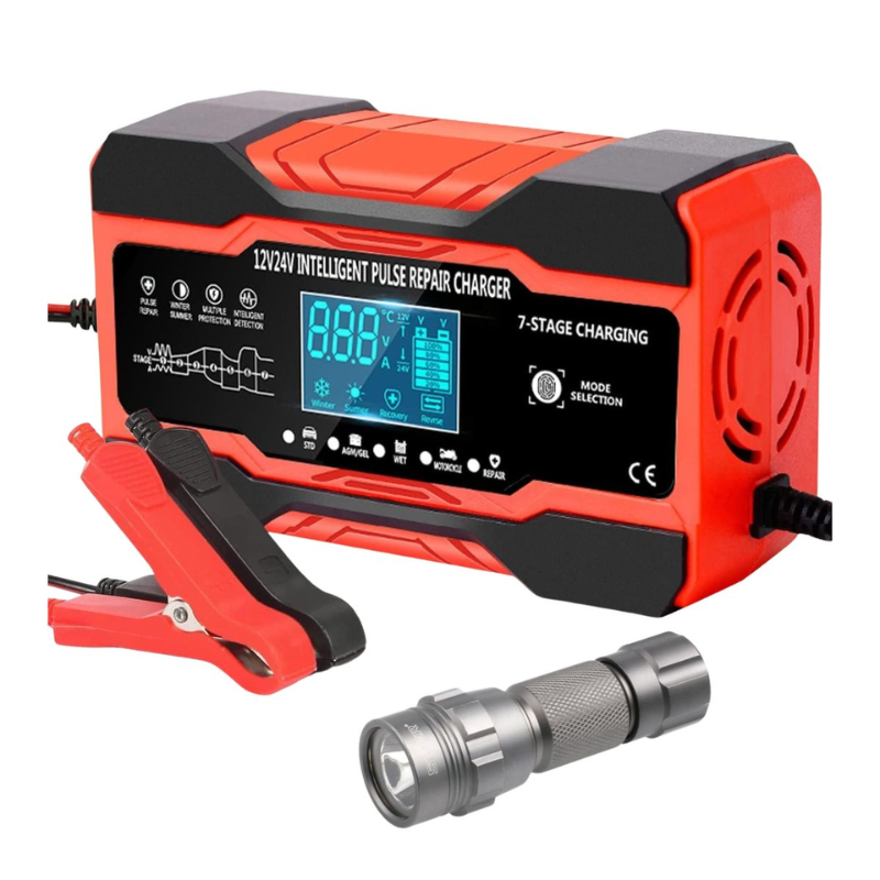 Revive and maintain your vehicle battery with the 12V 10A 7-Stage Intelligent Pulse Repair Charger—a smart charging solution designed for cars, motorcycles, and other 12V lead-acid batteries. This advanced charger comes equipped with an intelligent digital LCD display, allowing real-time monitoring of voltage, current, temperature, and charging power.