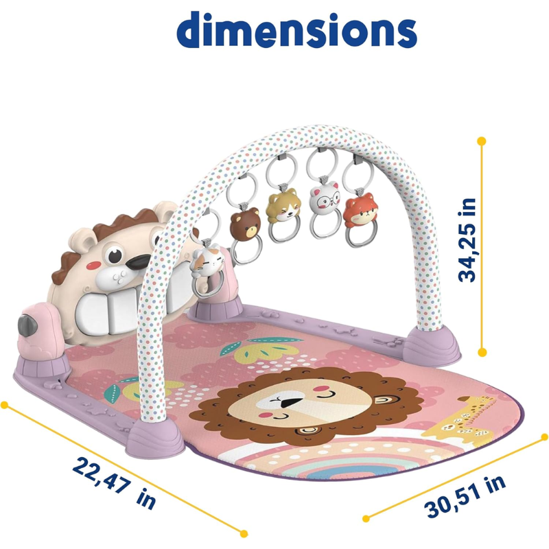Featuring a soft, padded mat with a colorful lion-themed design, the activity center includes a removable arch with five hanging toys to promote visual perception and tactile stimulation. The interactive piano at the base plays gentle melodies and sounds, carefully designed not to harm sensitive hearing, supporting auditory development in a calm and enjoyable way.
