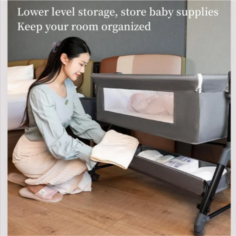 Designed with mobility and functionality in mind, this bedside crib is equipped with four silent wheels with brakes, allowing parents to move it effortlessly from room to room. The spacious interior provides ample room for your baby to stretch and sleep soundly, while the moderately firm, supportive mattress enhances comfort and safety. Additional features include a built-in mosquito net for extra protection, a large storage basket for baby essentials like diapers and blankets, and a side pocket for easy bottle access, making night care effortless.