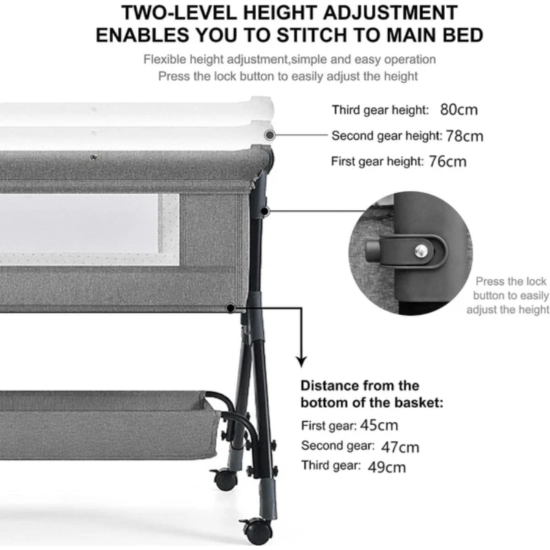 The crib’s adjustable height feature offers three height positions, making it compatible with various bed and sofa heights. Additionally, the incline mode is designed to help prevent infant reflux and provide a more comfortable feeding position. Constructed with a sturdy, durable frame, this crib ensures maximum stability while the breathable double-sided mesh promotes optimal airflow, keeping your baby cool, comfortable, and visible at all times.