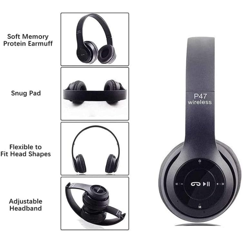 P47 Wireless Bluetooth Headphones – Foldable Over-Ear Headset with Microphone (Black)