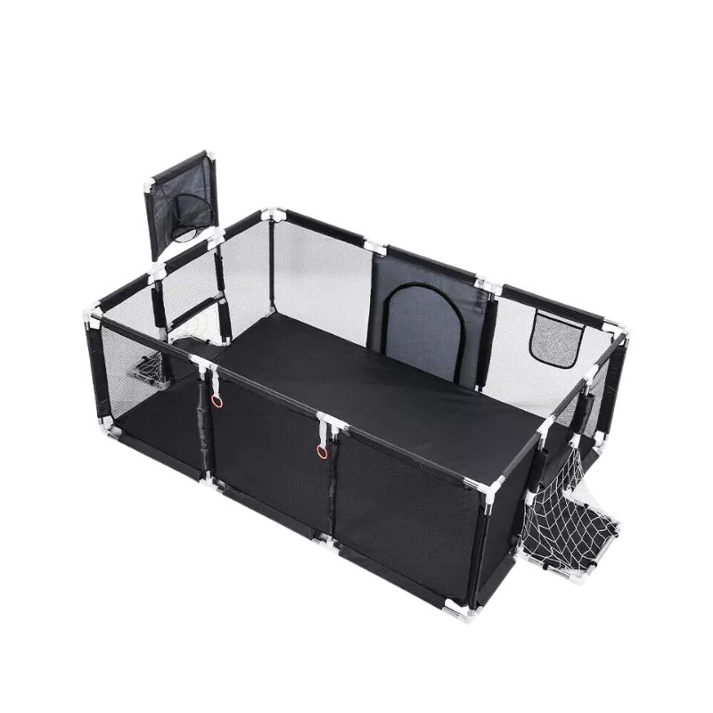Discover the ultimate playpen for babies and toddlers designed for safety, comfort, and fun. Measuring 190×129×66cm, this spacious baby fence is perfect for your child to play, explore, and learn while ensuring peace of mind for parents. The sturdy construction with professional connectors ensures excellent stability, while the oxford fabric and soft mesh are healthy, breathable, and easy to clean. Features include a basketball hoop, football goal, and hand pull loops to encourage physical activity and motor skill development. The external zipper door offers convenient access, while the side storage bag keeps essentials within reach. Ideal for indoor and outdoor use, this easy-to-install playpen is perfect for ages 6 months to 5 years.