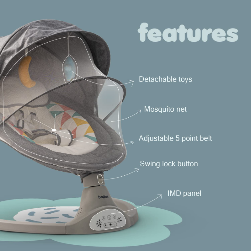 This baby swing is equipped with removable soft toys that encourage babies to reach, grasp, and play—enhancing their motor skills and hand-eye coordination. These engaging toys keep your baby entertained while also promoting cognitive development.