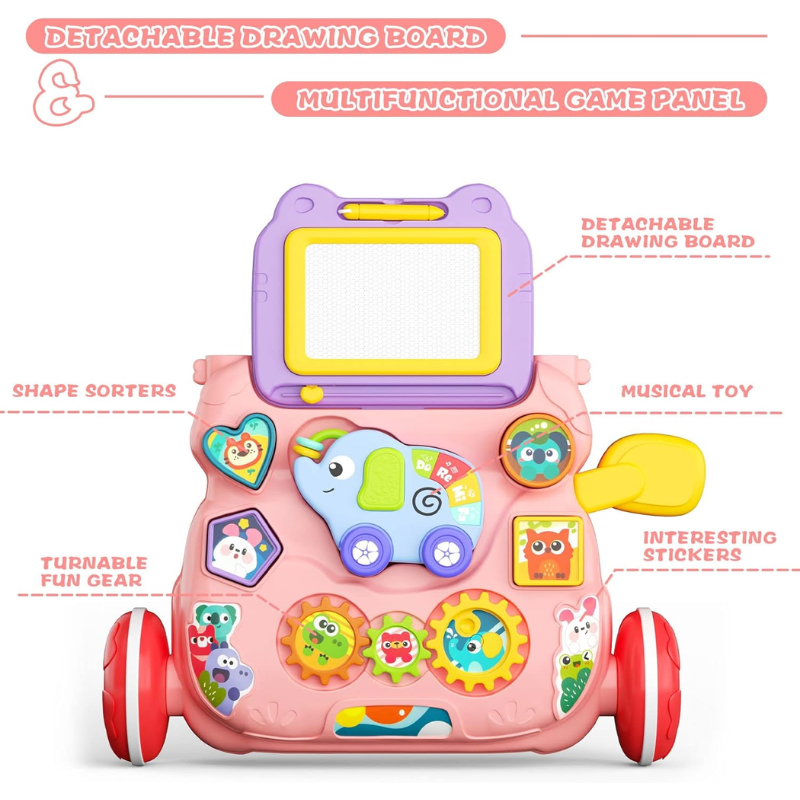 Equipped with a drawing board, this walker sparks your baby’s artistic side. The blank canvas invites endless doodles, fostering imagination, creativity, and fine motor skill development.