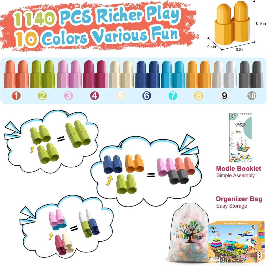 🌈 1140 Colorful Blocks: Comes in 10 bright colors for endless creative combinations.