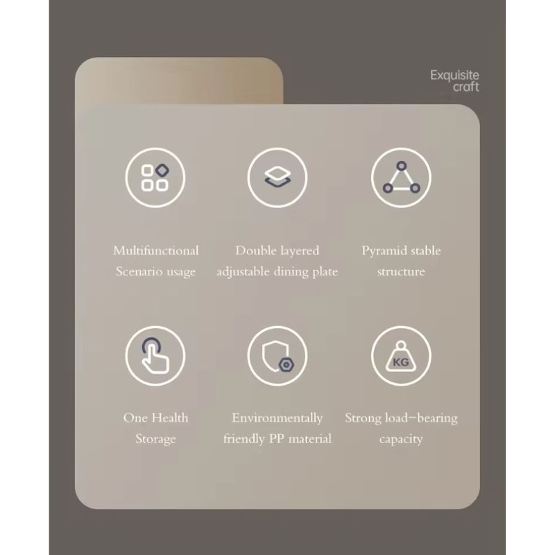 Its adjustable height mechanism allows caregivers to customize the chair’s position to match different dining table heights, making mealtimes more convenient and comfortable. The double plate design provides enhanced versatility, with two detachable trays that allow for simultaneous use—perfect for feeding, playtime, and snacks.